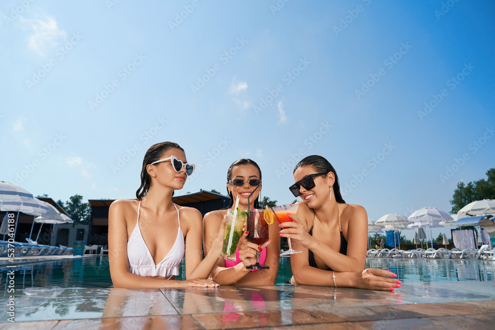 Front view of three girls standing in water in pool. Seductive young females having vacation, holding cocktails, clinking, smiling, talking. Concept of summertime and youth.
