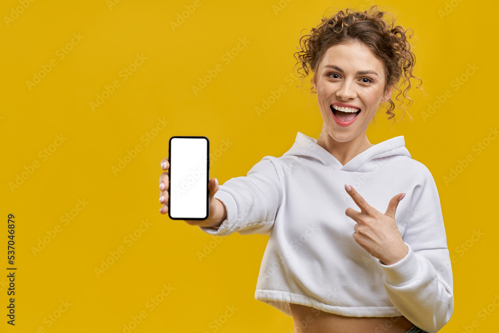 Close up of pretty girl smiling, holding smartphone. Young woman with curly hair standing with open mouth, happy, carefree, pointing by finger. Concept of modern technologies.