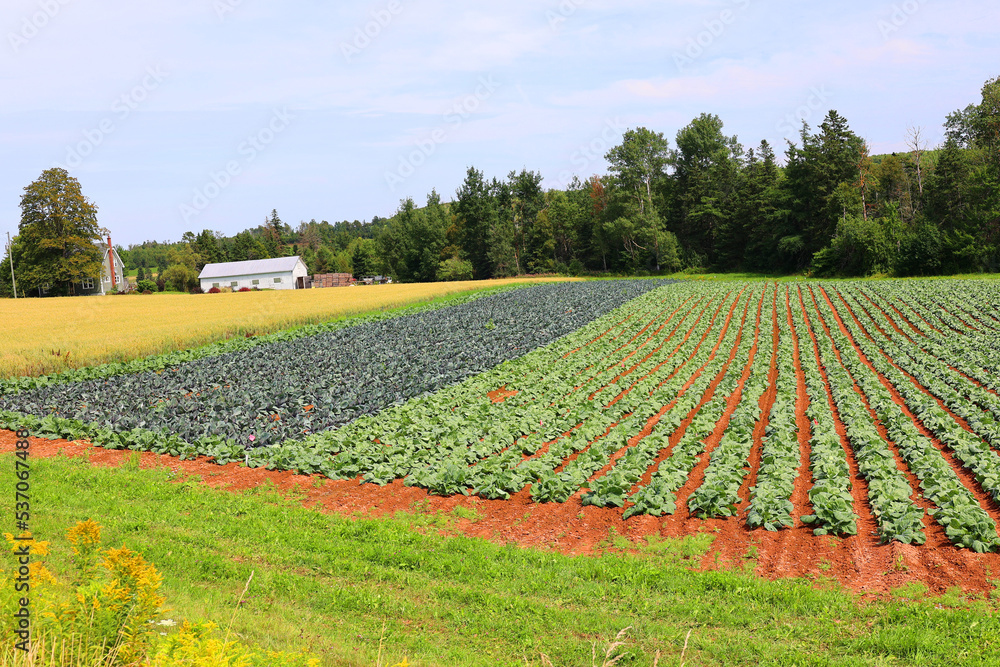 Cabage crops in rows on the field on summer day. Prince Edwards Island Canada