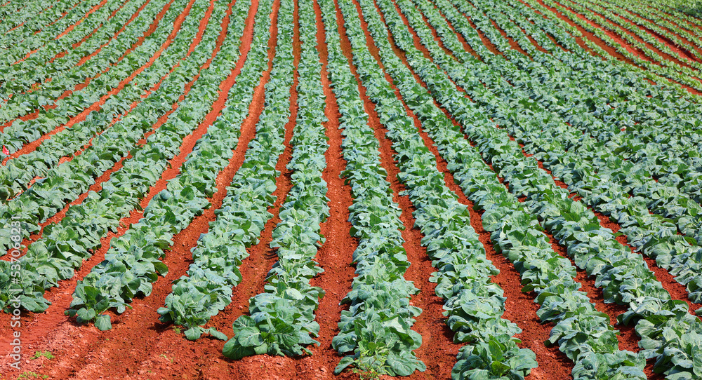 Cabage crops in rows on the field on summer day. Prince Edwards Island Canada