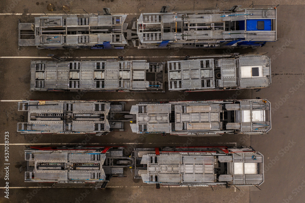 Drone view of big rig semi truck empty car haulers.