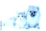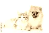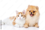 orange cat and dog. dog looking at camera. isolated on white