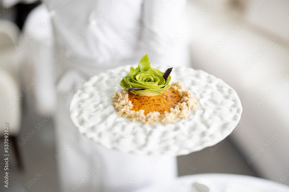 Chef holds a plate with delicious vegetarian meal decorated with flower made of avocado at restaurant of haught cuisine, close-up on dish