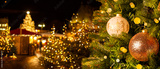 European Christmas city with festive fair or market in the evening. Christmas tree with beautiful balls on foreground. Holiday background.