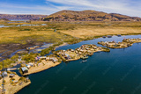 Aerial view of the Uros Straw Floating Islands on Lake Titicaca near Puno, Peru.