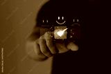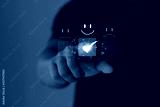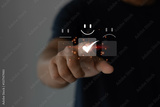 Customer service and Satisfaction concept. Men's hands doing online assessments in the satisfaction rating. He is pressing the face emoticon smile in satisfaction on the virtual touch screen.