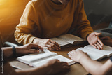 Christian couple or group reading study the bible together and pray at a home or Sunday school at church. concept studying the word of god.