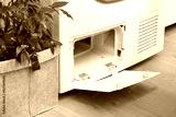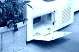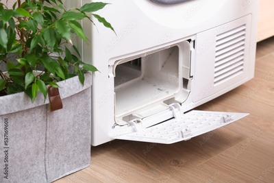 Drying machine with a full filter of lint, hair, dust, wool after the drying cycle of towels, bed linen. White drying machine. Dirty dryer filters.