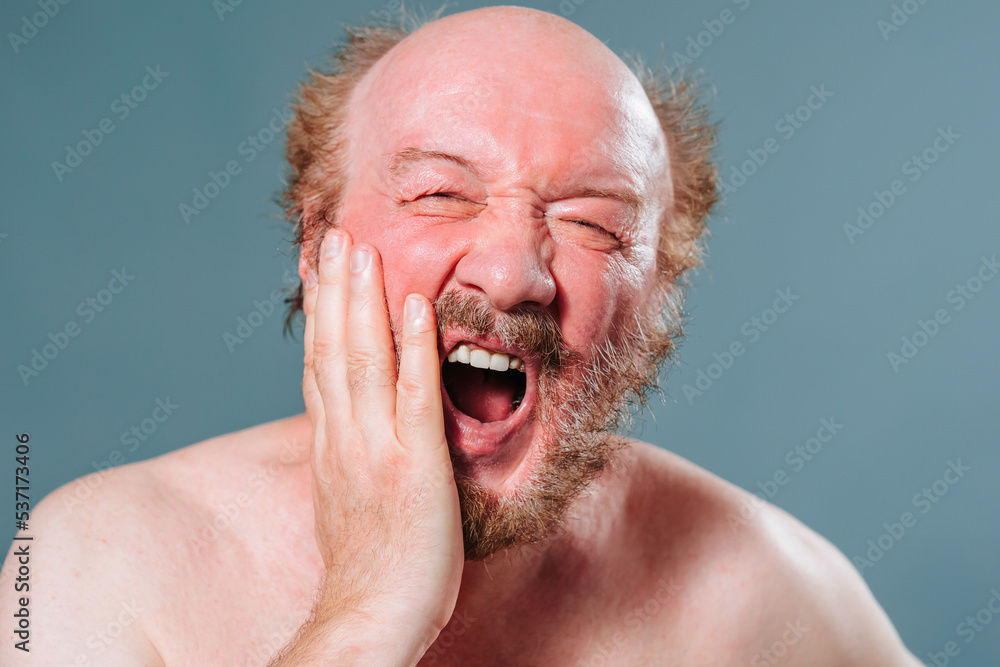 Front view upset unhappy elderly man holding his cheek screaming from toothache moustache bald gray hair. A concept suffering from toothache. Studio isolated blue background.