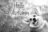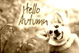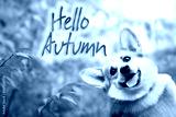 Autumn card with a portrait of a smiling corgi dog on a blurred colorful natural background of autumn foliage and text - hello autumn. Template, copy space.