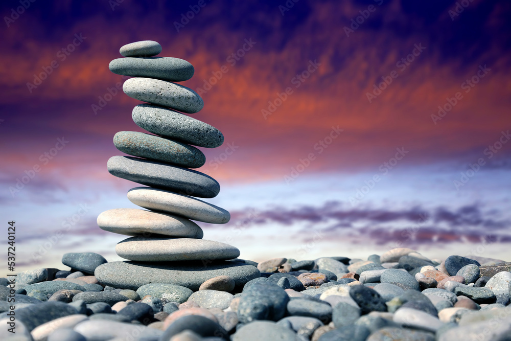 balance of stones on the background of nature. pyramid of smooth stones against a colored sky. natural balance of life.