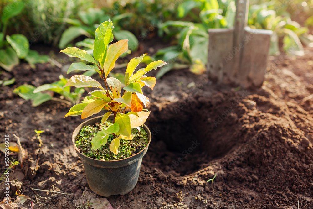 Preparation for planting magnolia into soil. Small tree in container ready for transplanting in fall garden