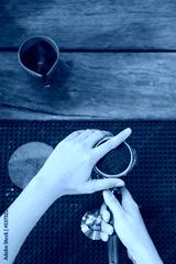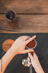 Top view of a hand holding a filter holder with ground coffee in a Cafe or coffee shop. A professional barista. Concept of modern warm coffee shop and Preparing process of coffee.