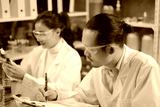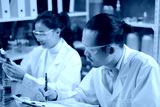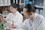Male Scientist is looking and recording the result of laboratory eco or natural cosmetic, medicine, organic skin care, while Female scientist is dropping the liquid of experiment.