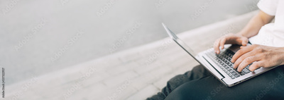 close up side view of laptop and male hands typing. Using computer on the go. Surfing internet. Studying. Video chat. relaxed posture. Blank mockup screen. banner