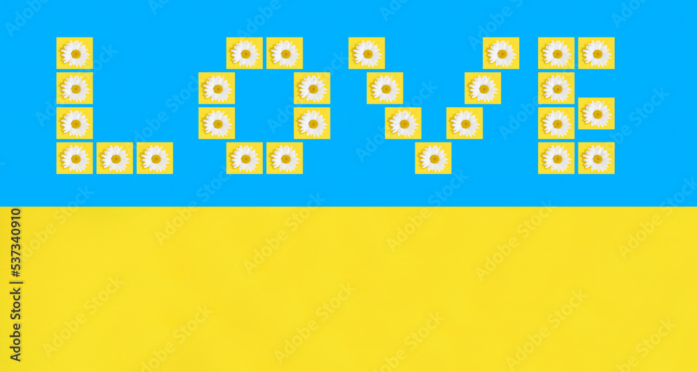 Collage. Word love lined with chamomiles on the blue background. Copy space. Top view.