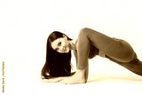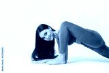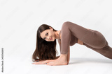 Yoga training or stretching workout with a young asian woman in difficult yoga pose on a white background.