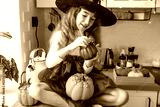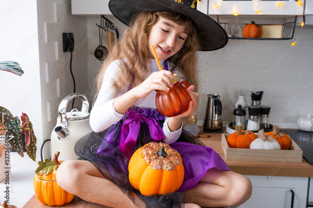 Child drinks pumpkin juice, vegetable smoothie or cocktail from a mug with a straw. Kitchen decorates for Halloween. Girl in a witch costume. Autumn cozy in home