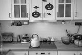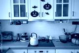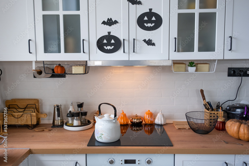 The interior of the Scandi-style white kitchen is decorated with pumpkins for Halloween. Autumn mood, home decor for the holiday