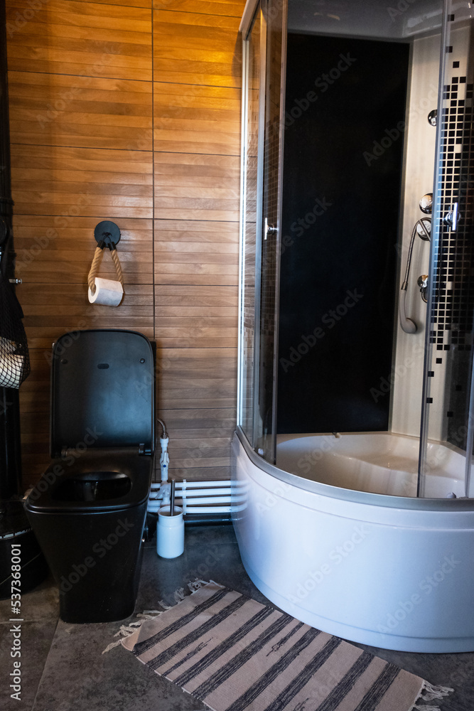Loft-style toilet and shower, dark interior, combination of black and wood. Black toilet bowl, cozy knitted rug