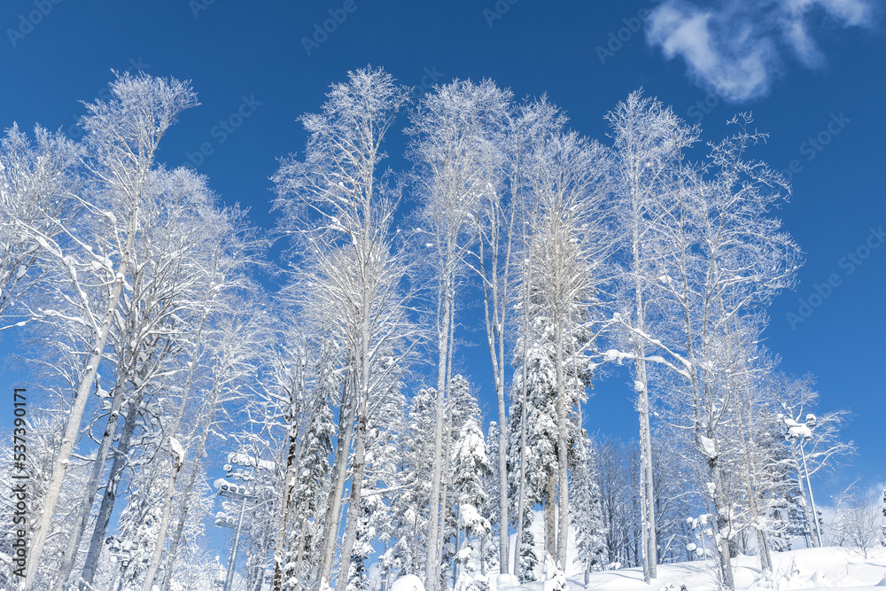 Scenic view of many birch trees covered by fresh hoar frost snow mountain forest against clear blue sky bright cold sunny winter day. Natural woods cold weather wallpaper background. Nature panorama