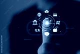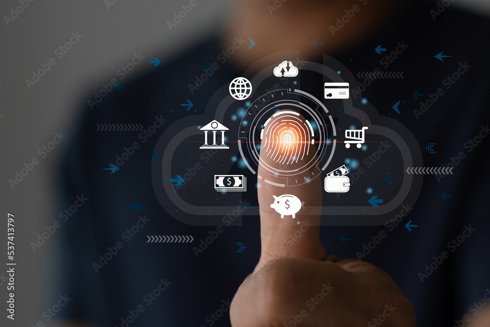 futuristic digital processing of biometric identification fingerprint scanner for access personal financial data. surveillance and security scanning of digital programs cyber futuristic applications.