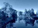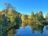 Autumn trees reflected in lake water at sunny day.