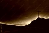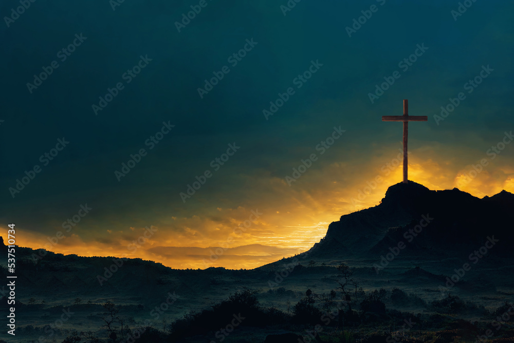 Shining cross on Calvary hill, sunrise, sunset sky background. Copy space. Ascension day concept. Christian Easter. Faith in Jesus Christ. Christianity. Church worship, salvation concept