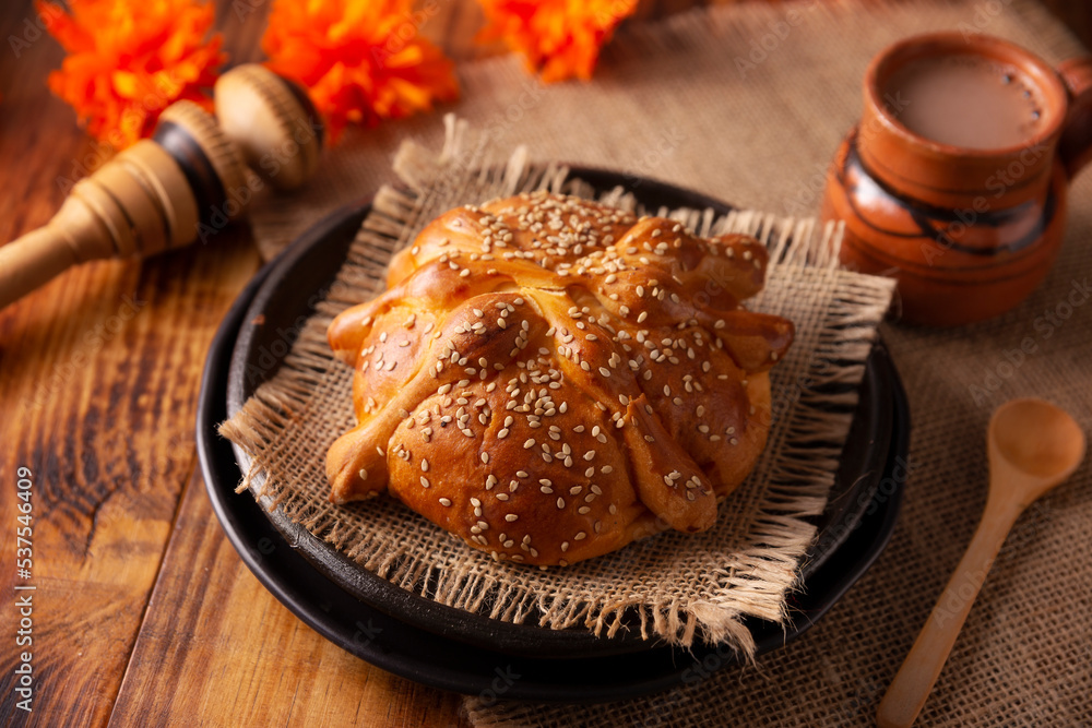 Pan de Muerto. Typical Mexican sweet bread with sesame seeds, that is consumed in the season of the day of the dead. It is a main element in the altars and offerings in the festivity