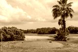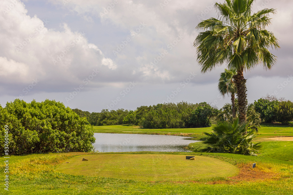 Beautiful view of nature landscape with golf course spot in front of little pond. Green bushes and pale blue sky on background. Aruba.