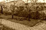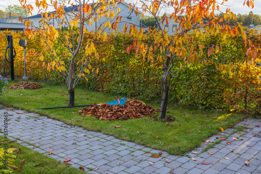 Gorgeous colorful view of gathered fallen leaves under cherry tree on front yard. Sweden.