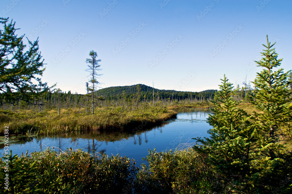 Scenic view of beautiful lush bog marsh with pond in brighton new york in late summer, showing larch trees and evergreen spruce with mountains in the background.