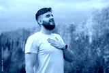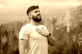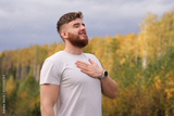 young bearded relaxed calm man enjoying good weather in the forest, autumn park, breathing deep fresh air and smiling. Guy with beard holding his hand on chest, heart with his eyes closed
