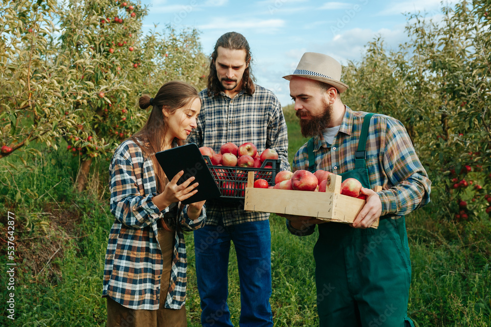 Front view farming horticulture farming harvest people concept 3 young farmers with digital tablet work farming. Men hold crates of apples in their hands. Woman with an electronic tablet in her hands
