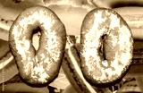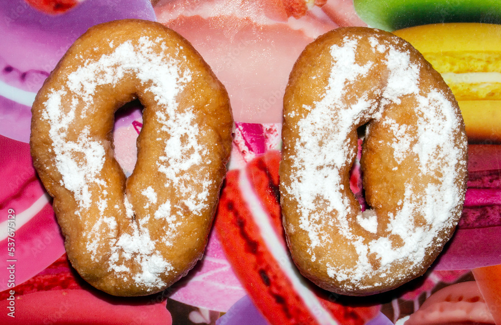 A doughnut in powdered sugar.Crumpet in powdered sugar, fried in oil.Berliner in the Sahara.Donat baking.