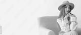 Beautiful fashionable young woman in elegant clothes sitting in armchair on light background with space for text