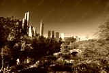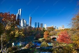 New York City skyscrapers, skyline captured from behind autumn foliage against a blue sky