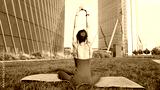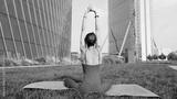21 year old girl performs yoga gymnastic sport near modern downtown skyscrapers - relax and meditation in Milan city - fight the hustle and bustle of urban life with physical and mental exercises
