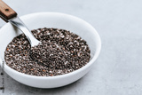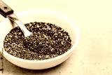 Chia seeds. Organic Dry Black and White Chia Seeds in bowl on gray stone background