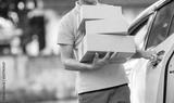 A delivery man is delivering cardboard boxes to customers at the door of a private car. young man delivery man in casual clothes Parcel moving service
