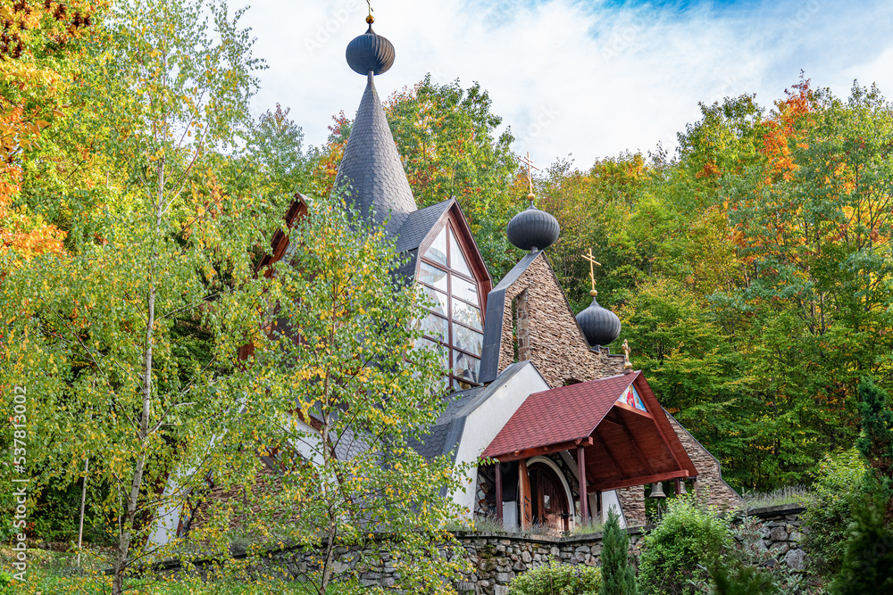The building of the Modern Orthodox Church against the backdrop of the autumn forest.