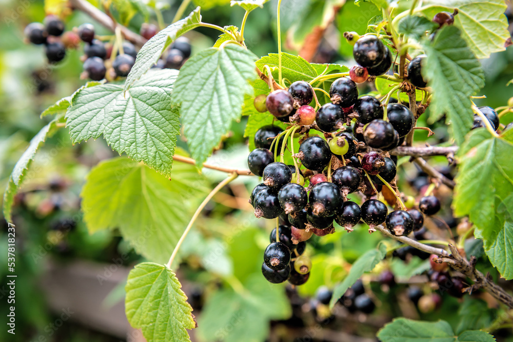 Ripe delicious black currant on the twig