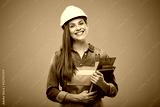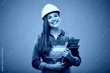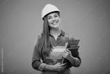 Smiling woman engineer in safety helmet and overall holding books and clipboard. Isolated female builder portrait.