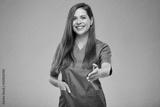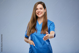 Smiling nurse woman in blue medical suit giving handshake. Isolated female portrait.
