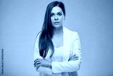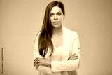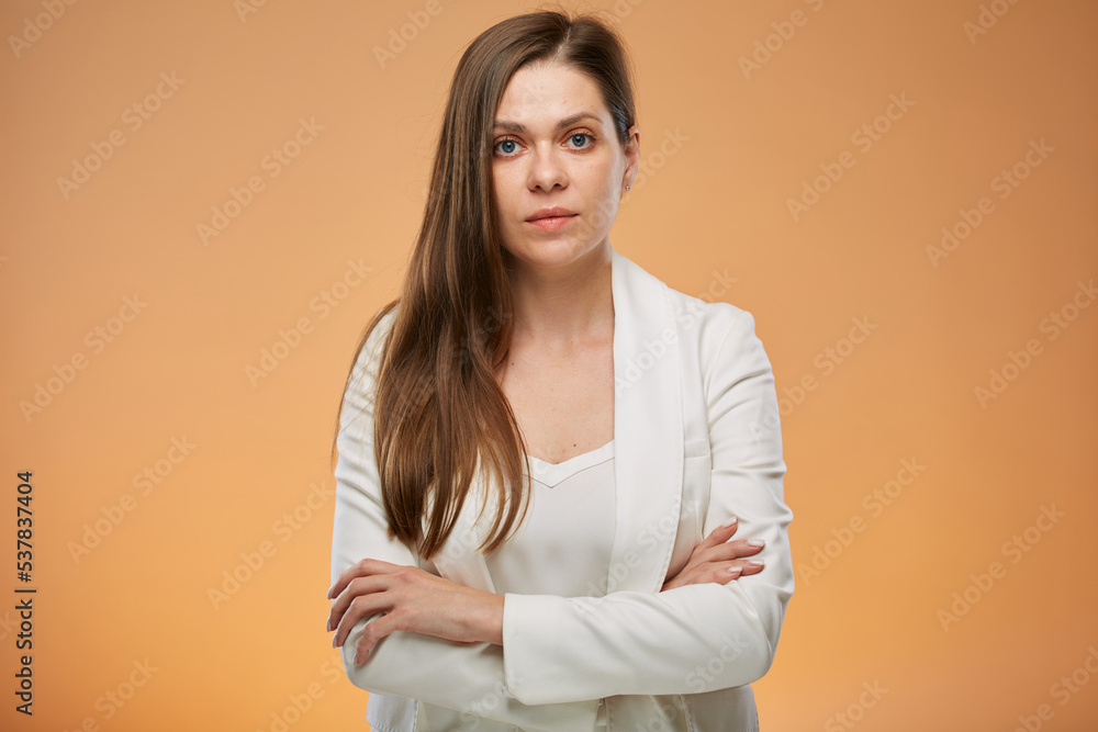 Serious business woman in white suit on yellow. Isolated female portrait.
