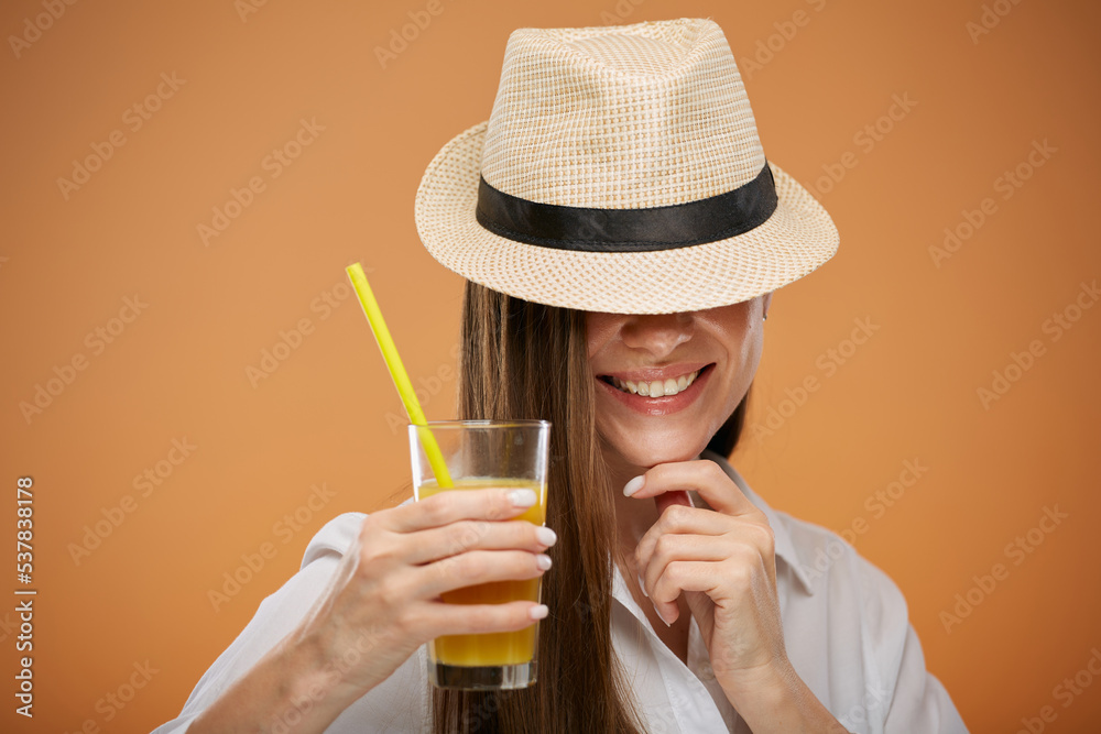Happy woman hiding her eyes with hat tilting face down and holding orange juice. Isolated female advertising portrait.