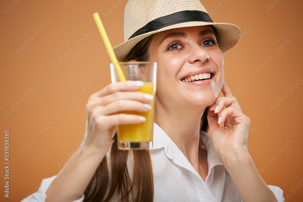 Smiling woman holding orange juice touching her face looking away. Isolated female advertising portrait.