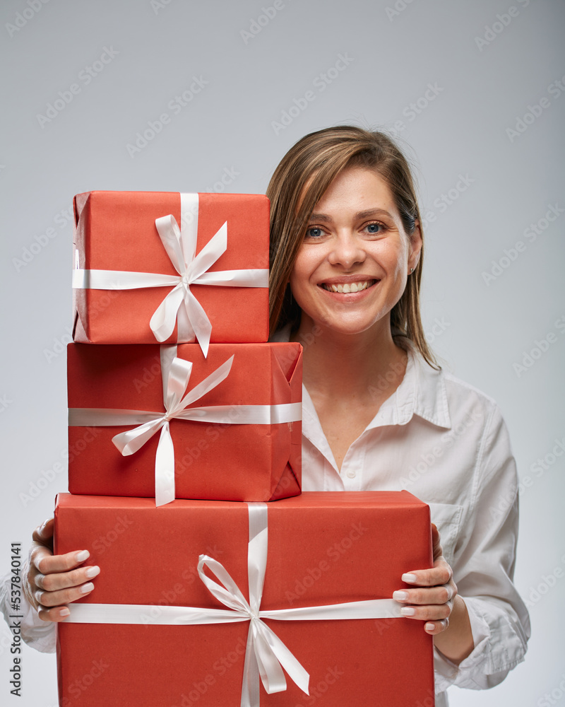 Happy woman after shopping holding stack gift boxes. Isolated female portrait.