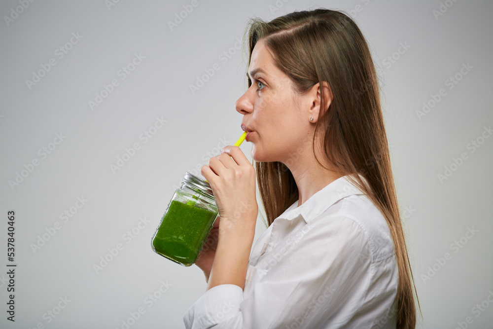 Profile view of smiling woman drinking green smoothie and looking up. Isolated female advertising portrait.
