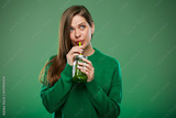 Smiling woman drinking green smoothie and looking up. Isolated female advertising portrait on green.